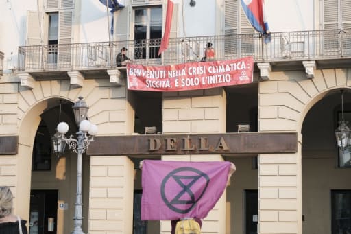 Dopo aver appoggiato al muro una scala lunga 10 metri, imbragate e assicurate, due attiviste di Extinction Rebellion sono salite fino al balcone del Palazzo della Regione che affaccia su piazza Castello. Scavalcata la ringhiera hanno appeso un grande striscione rosso, solcato da righe scure a rappresentare la terra arida e spaccata, con scritto "Benvenuti nella crisi climatica. Siccità, è solo l'inizio". Si sono poi incatenate alla ringhiera e hanno atteso l'arrivo delle forze dell'ordine.