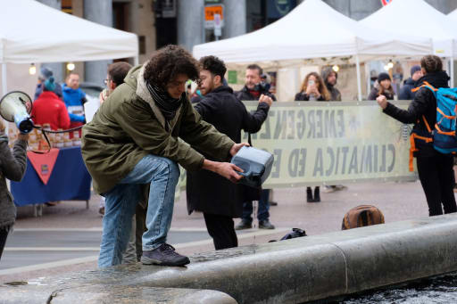 Torino, 4 dicembre 2022 | Due attivisti di Extinction Rebellion hanno colorato di nero l’acqua delle fontane del Po e della Dora presenti in Piazza CLN per denunciare lo stato di siccità e inquinamento in cui si trovano i due fiumi torinesi.