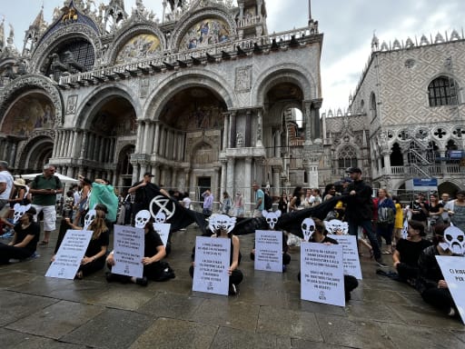 Venezia, 1° luglio 2023, ore 11 una trentina di cittadini aderenti al movimento Extinction Rebellion si sono seduti di fronte alla Basilica di San Marco per denunciare l'inazione politica della Regione Veneto rispetto alla salvaguardia di Venezia dalle conseguenze dell'emergenza climatica ed ecologica. Alcuni di loro, vestiti i di nero e indossando maschere raffiguranti teschi di animali in via di estinzione.