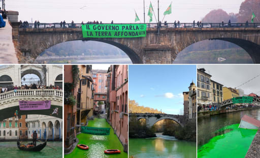 A Torino e a Milano, una casa “affondata” è comparsa nelle acque verdi del Po e dei Navigli, mentre a Venezia alcune persone si sono appese con imbraghi al ponte di Rialto, sopra le acque verdi del Canal Grande. A Bologna alcuni canotti sono stati rilasciati nel famoso canale del Reno che passa in centro città, noto come “la piccola Venezia”. A Roma, l’isola Tiberina è stata circondata dalle acque verdi del Tevere. “Il colorante usato” rassicura Paola da Venezia “è semplice fluoresceina. Un *sale innocuo* usato da idraulici come tracciante e addirittura per segnalare la posizione di subacquei dispersi in mare”. Infatti quando lo scorso maggio per errore venne sversata nel Canal Grande, gli esperti furono unanimi nell'escludere un pericolo per le persone e per fauna e flora. “Tra qualche ora, queste acque torneranno come prima. Il colore dei nostri mari e dei nostri fiumi, però, continuerà a cambiare man mano che le temperature continueranno ad aumentare”. Diversi studi scientifici mostrano infatti che già adesso è in corso un cambiamento di colore degli oceani, fenomeno che riflette un'alterazione degli ecosistemi acquatici e che continuerà ad aumentare a causa dell’aumento delle temperature.