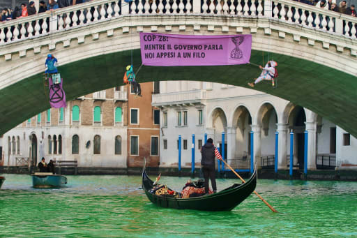 A Venezia il livello del mare si sta alzando sempre di più. Tre persone si sono calate con imbraghi da un ponte per ricordarlo a tutti i cittadini, e sono state denunciate, espulse dalla città per 4 anni e umiliate pubblicamente dal Sindaco e da un Ministro del Governo italiano. Chi accuseranno quando il Canal Grande sarà davvero bloccato perché il mare avrà invaso Venezia?