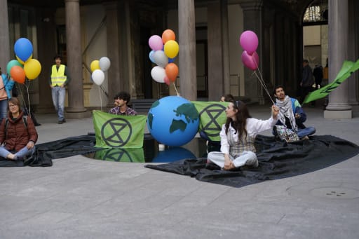 Nel pomeriggio di oggi, a Torino, una ventina di persone legate a Extinction Rebellion hanno occupato le Gallerie d’Italia di Piazza San Carlo, museo di Intesa Sanpaolo, dove hanno steso a terra drappi neri e esposto un mappamondo a cui sono stati legati molti palloncini colorati. Appeso anche uno striscione con scritto “Intesa Sanpaolo: quanti palloncini per volare via dal fossile?”.
