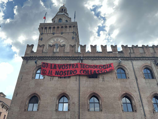 Bologna, 09/07/2024 – Occupato il comune di Bologna da Extinction Rebellion per denunciare l’ipocrisia dei governi del G7 che “per anni hanno denigrato la scienza e in questi giorni sono a Bologna per osannarla”. Alcune persone si sono appese alla terrazza del palazzo, su piazza Maggiore, per esporre uno striscione con scritto: “G7: la vostra tecnologia, il nostro collasso”. Rovesciato anche un cumulo di vecchi computer simbolicamente insanguinati. Intervenuti agenti della digos che hanno sequestrato e rotto telefoni cellulari.