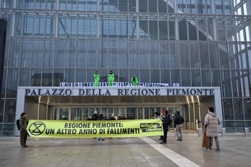A poche settimane dal blocco della Leonardo spa a Brescia, Extinction Rebellion torna in azione a Torino: un gruppo di persone si è arrampicato questa mattina sopra la tettoia di ingresso del Grattacielo della Regione Piemonte e ha incollato una maxi scritta che recita “La Regione osserva, il Piemonte affonda”, dopo aver appeso uno striscione con scritto “Regione Piemonte: un altro anno di fallimenti”.