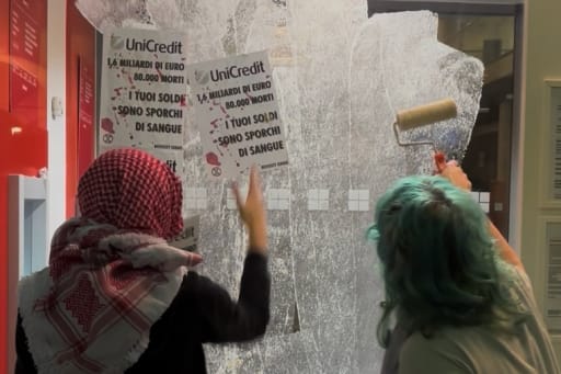 La scorsa domenica, a Treviso, Extinction Rebellion ha ricoperto alcune vetrine delle sedi di Intesa Sanpaolo e Unicredit con volantini, incollati con acqua e farina, su cui si legge “Chiudi il conto, apri gli occhi”. Accanto ai volantini, impronte di mani e la scritta “Boycott Israel” tracciata in rosso per richiamare le decine di migliaia di vittime civili che si continuano a contare a Gaza. Un gesto simbolico e nonviolento per puntare i riflettori sulle responsabilità delle istituzioni bancarie nel genocidio in corso a Gaza.