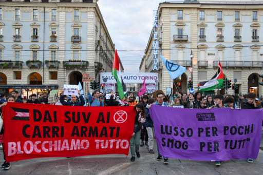 “Questo è il quarto anno consecutivo in cui le strade e le piazze storiche di Torino vengono usate per esporre e far sfilare auto inquinanti e costosissime. Quest’anno, inoltre, il Salone ospita anche aziende coinvolte nel genocidio del popolo palestinese” dichiara Matilde di Extinction Rebellion. “Uno sfregio nella città più inquinata d’Italia, in cui i lavoratori dell’automotive affrontano da anni licenziamenti e cassa integrazione, e un evento immorale di fronte a quello che sta succedendo a Gaza. Se non lo fermano le istituzioni, lo blocchiamo noi”. Il riferimento è all’ondata di proteste intensificate nelle ultime settimane in cui, sotto lo slogan “blocchiamo tutto”, sono stati bloccate autostrade, stazioni, porti ed eventi in moltissime città d’Italia, per chiedere lo stop alle forniture di armi italiane a Israele e la tutela della Global Sumud Flottila affinché possa portare a termine la missione umanitaria. Come riporta Extinction Rebellion, il Salone non è un evento casuale. Tra i marchi presenti ci sono Allianz e Hyundai, due delle tante multinazionali citate in un rapporto delle Nazioni Unite a cura della relatrice speciale per i territori palestinesi, Francesca Albanese, per aver tratto profitto dalle operazioni militari di Israele a Gaza. Secondo il documento, Hyundai Heavy Industries - la sezione del gruppo che produce escavatrici e i mezzi pesanti -, ha fornito macchinari utilizzati per la demolizione di abitazioni e edifici a Gaza e nei Territori Palestinesi Occupati, mentre Allianz ha investito in aziende della difesa coinvolte nel conflitto.