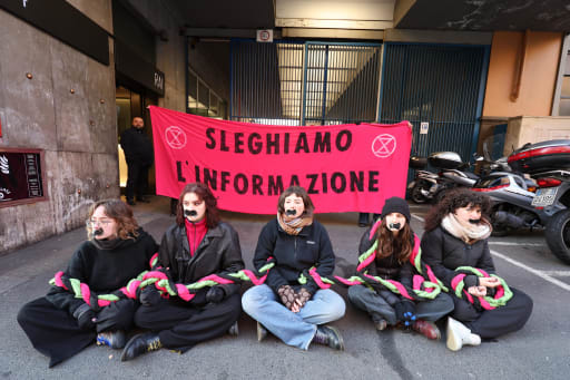 Torino, 25/11/2025 - Extinction Rebellion ha occupato l’ingresso della Rai di Via Verdi, dove una decina di donne si sono legate tra loro e coperte la bocca con scotch nero. “Sleghiamo l’informazione” è la scritta sullo striscione che hanno esposto nella giornata mondiale per l’eliminazione della violenza contro le donne, per denunciare la narrazione distorta che i media portano avanti su femminicidi ed ecocidi.